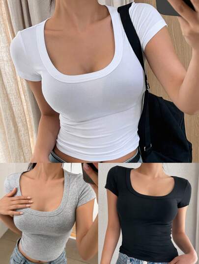 DAZY Camiseta de mujer de manga corta con cuello en U, corte slim, de múltiples colores para el verano, tops cortos para mujeres - Multicolor - Añade 3
