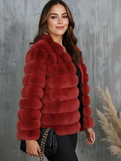 Abrigo Elegante de Color Sólido con Parte Delantera Abierta y de Peluche, Envolvente para Mujer Ideal para Otoño/Invierno - Rojo - Añade 1