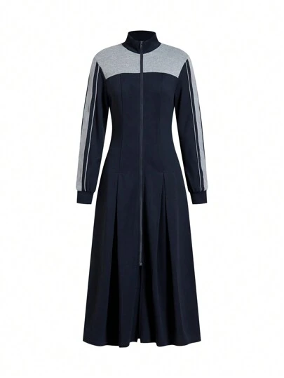 Mulvari Vestido largo de manga larga con cremallera y color de contraste para mujer - Azul - Añade 5