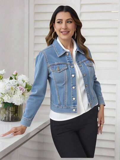 Chamarra cazadora crop corta mezclilla gruesa mangas abullonadas pliegues look clásico casual fresco botones bolsillos frontales toda ocasión primavera verano otoño invierno. - Azul - Añade 1