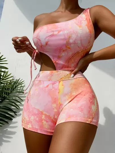 Bañador una pieza con estampado de mármol con abertura de un hombro - Multicolor - Añade 1