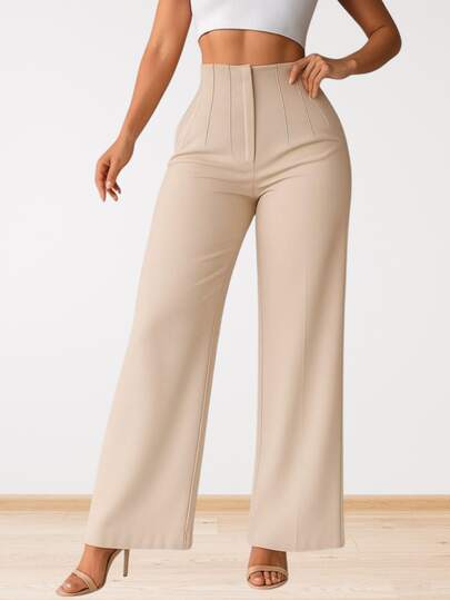 Pantalón Mujer Elegante y Moderno.  Tiro Alto y Pierna Amplia. - Beis - Añade 3