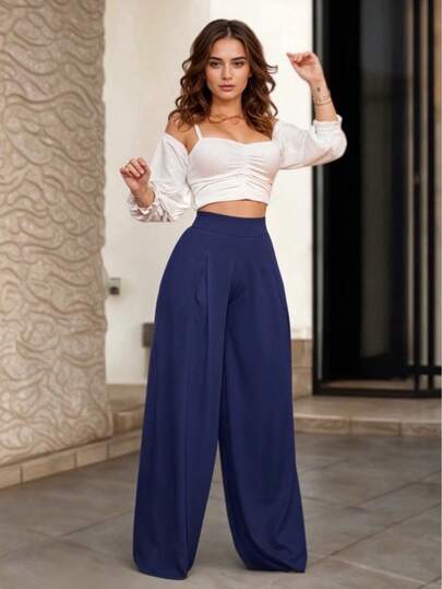 Pantalón Holgado Elegante con Corte Tipo Campana sin Bolsas para Mujer - Azul Marino - Añade 1