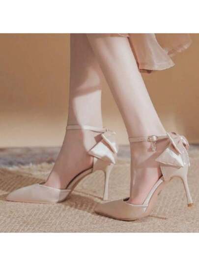 Zapatos de tacón elegantes de estilo francés para mujer, con adorno de lazo en el talón, tacón fino de color liso y puntera puntiaguda, ideales para bodas. - Rosa - Añade 1