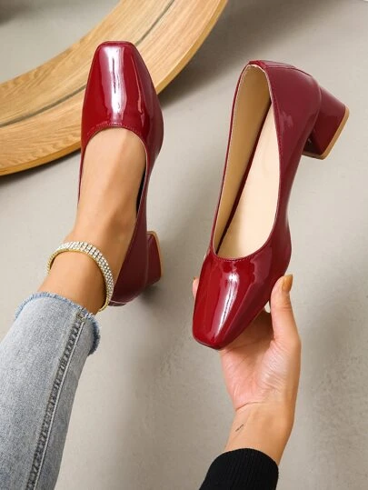 Zapatos de tacón grueso con punta cuadrada para mujer Zapatos de salón rojos a la moda - Rojo - Añade 1
