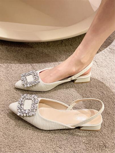 Sandalias romanas con tiras de tobillo, punta puntiaguda y tacón grueso con diamantes de imitación para mujer, planas, para primavera y otoño - Beis - Añade 1
