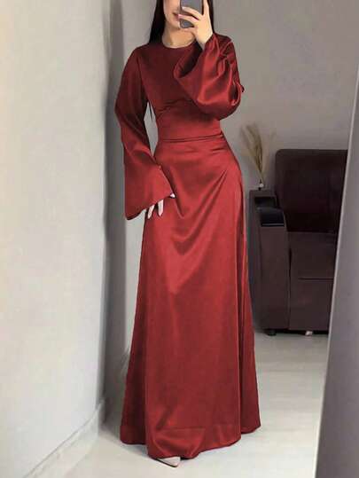 Vestido de manga larga con cuello redondo de satén de unicolor para mujer - Rojo - Añade 1