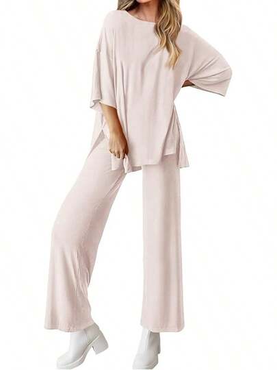 COLIZAMX Conjunto Deportivo de 2 Piezas Mujer Manga Corta Pantalones de Pierna Ancha para Yoga en Casa - Beis - Añade 10