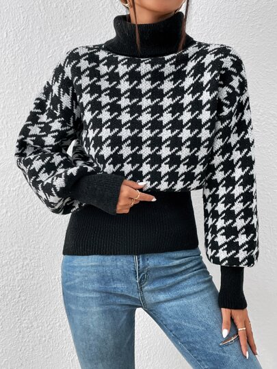 SHEIN Privé Jersey con patrón de pata de gallo cuello alto de hombros caídos - Negro - Añade 1
