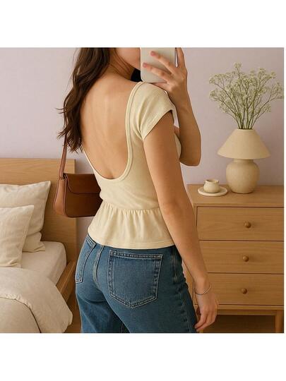 Blusa beige sin mangas cuello barco ajustada mujer casual elegante espalda descubierta - Beis - Añade 1