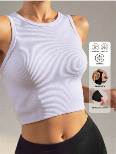 1 pieza Sujetador deportivo para mujer de color liso, con tirantes plateados y espalda de tipo racer, cómodo - Blanco - Añade 2