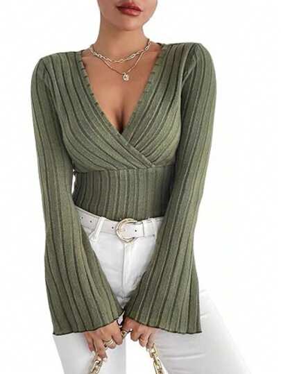 Chaleco ajustado con escote en V acanalado para mujer - Verde militar - Añade 1