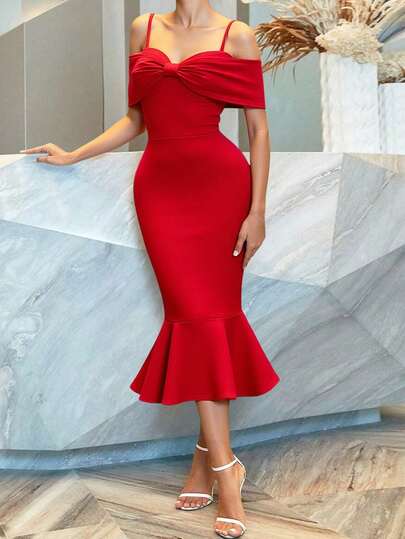 Vestido mini ajustado sexy con hombros descubiertos, de unicolor, para mujer - Rojo - Añade 1