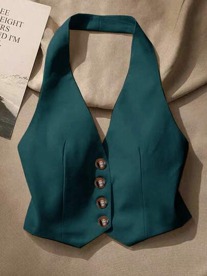 Camiseta de tirantes sin mangas de un solo pecho de unicolor y cuello de halter, versátil y de moda para mujeres - Azul eléctrico - Añade 1