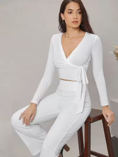 SHEIN Conjunto top tejido de canalé con pantalones - Blanco - Añade 1