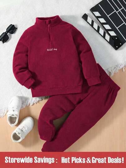 SHEIN Chico joven Pantalones deportivos con sudadera con bordado de letra con cremallera media - Burdeos - Añade 1