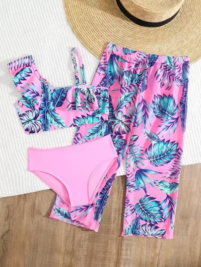 Conjunto de bikini con estampado tropical y ribete de volantes con pantalón cubridor para niña joven, playa de verano - Rosa - Añade 3