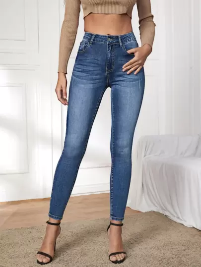 SHEIN Essnce Jeans ajustados con cremallera - Azul lavado oscuro - Añade 5