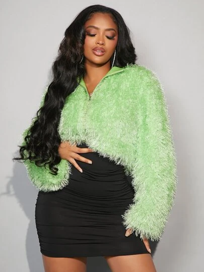 SHEIN SXY Abrigo con cremallera delantera bajo irregular de peluche - Verde Lima - Añade 6