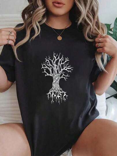 Camiseta de algodón 100% con estampado del Árbol de la Vida - Geometría Sagrada Yoga New Age, de cuello redondo, casual, de manga corta, estilo deportivo, casual elegante/estilo callejero para mujer - Negro - Añade 1