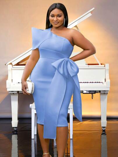 Vestido ajustado de un hombro lazo grande lado - Azul - Añade 2