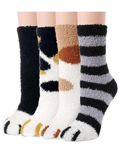 4 invierno cálido dibujos animados lindo con pata de gato Calcetines suave de peluche mullido gracioso Calcetines para hombres Mujer - Multicolor - Añade 4