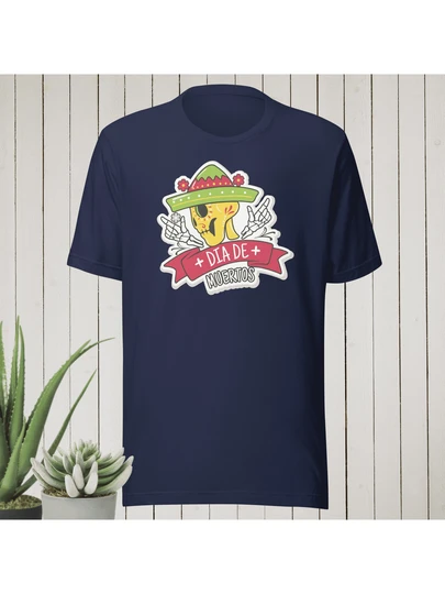 Playera Día de Muertos "Calaca de lado con Sombrero". Camiseta de Calacas. Playera de Halloween. Playera 100% Algodón. Manga Corta. Cuello Redondo. - Azul Marino - Añade 1