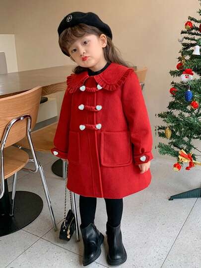 Abrigo de invierno rojo de Navidad para niñas 2024, chaqueta larga con cuello con volantes cálido para niños - Rojo - Añade 2