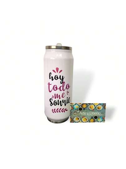 Termo tipo lata de acero inoxidable, 500 ml. Tapa con popote retractil. Estampado: Frase motivacional - Blanco - Añade 1