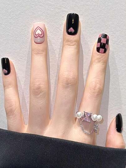 24 piezas de láminas de uñas cortas dulces y geniales con diseño de tablero de ajedrez + 1 pieza de gelatina de gel + 1 lima de uñas. Suministros de uñas para uñas de presión - Multicolor - Añade 3