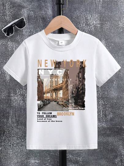 Camiseta De Manga Corta Con Estampado De Paisaje Y Eslogan Para Niños - Blanco - Añade 4