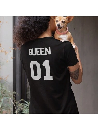 Playera para Mujer 1 Pza Estampado en Espalda Dama King & Queen 01 para Novios o Parejas San Valentín 14 de Febrero - Negro - Añade 1