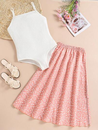 SHEIN Conjunto Primavera/Verano para niña mayor: Mono blanco y falda de estampado floral en color naranja/rosa, 2 en 1 ideal para viajes, ocasiones casuales y vacaciones. - Rojo y blanco - Añade 2