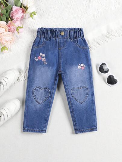 Pantalones vaqueros de mezclilla para bebé con efectos de chorro de arena, pintados con spray, apliques y bordados - Azul lavado medio - Añade 1