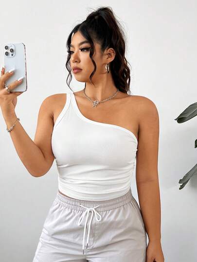 CovetEZ Top blanco acanalado con pliegues de un solo hombro en talla grande - Blanco - Añade 1