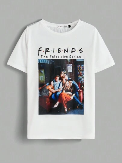 FRIENDS X SHEIN Camiseta clásica de mujer de manga corta, cuello redondo, ajustada, de color blanco, adecuada para el verano - Blanco - Añade 4