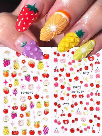 2 Hojas de Pegatinas de arte de uñas de verano con relieve 5D de frutas, Calcomanías de relieve de gelatina lindas de cereza, naranja y pera para decoración de manicura de dopamina - Multicolor - Añade 5