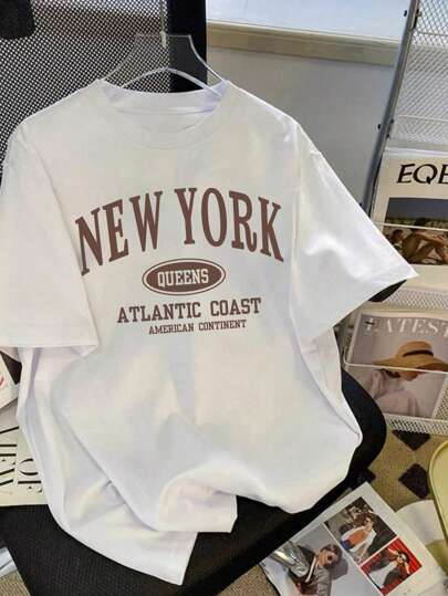 SHEIN Ropa escolar para niñas adolescentes, camiseta de punto blanca extragrande con impresión de letras de Nueva York en estilo universitario casual, adecuada para el verano - Blanco - Añade 1