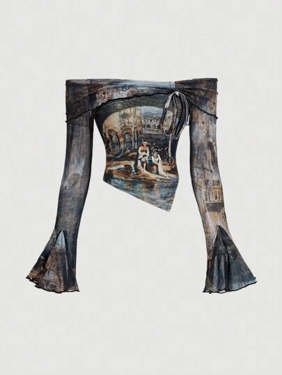 SHEIN MOD Blusa de patrón vintage con hombros descubiertos y mangas acampanadas para mujer con pieza insertada - Multicolor - Añade 1