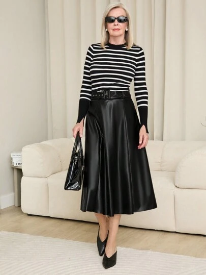 SHEIN LUNE Falda larga y elegante de piel de PU negra con cinturón y decoración, ropa de otoño para mujer - Negro - Añade 1