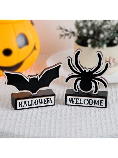1 pieza Cartel de madera con diseño de araña y murciélago de Halloween, decoración de fiesta de fantasma y calabaza para sala de estar y dormitorio - Multicolor - Añade 2