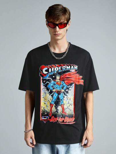 ROMWE MEN SUPERMAN X ROMWE Camiseta casual de moda de manga corta con cuello redondo y estampado creativo para hombre - Negro - Añade 5