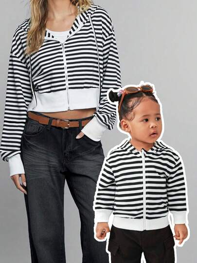 SHEIN Conjunto a juego casual de mamá e hija, sudaderas con capucha y cárdigan a rayas en blanco y negro (las 2 piezas se venden por separado) - Negro - Añade 2