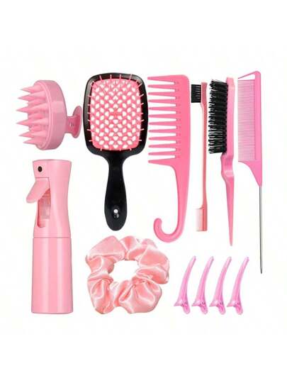 12 piezas Juego de cepillo para el cabello y peine para peinado, cepillos para desenredar el cabello para mujeres y hombres con cabello rizado, juego de cepillos con cepillo desenredante, cepillo para esponjado, peine con punta, cepillo para bordes, cepillo de masaje de silicona para el cabelludo para ducha, cepillo para cabello rizado con botella de spray de 200ml - Multicolor - Añade 10