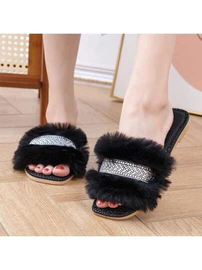 Sandalias pantunflas con peluche para mujeres ,Chanclas con diseño brillos comoda y ligera - Negro - Añade 1
