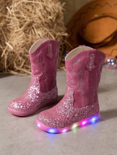 Botas occidentales brillantes rosas de moda con luces LED para niñas, con alas bordadas - la opción perfecta para la temporada de otoño/invierno - Rosa Fucsia - Añade 5