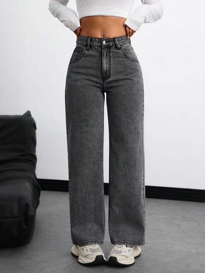 Pantalones vaqueros anchos holgados casuales y versátiles con bolsillos para mujeres - Gris - Añade 1