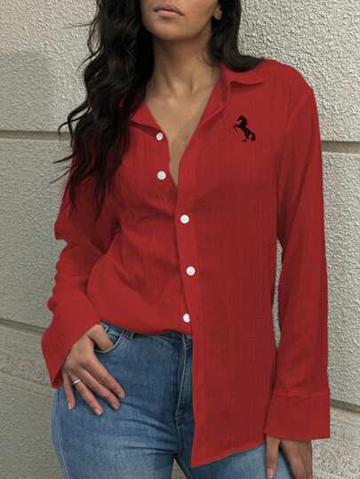 INAWLY Camisa informal de mujer de una hilera con estampado de caballos de manga larga para el otoño - Rojo - Añade 1
