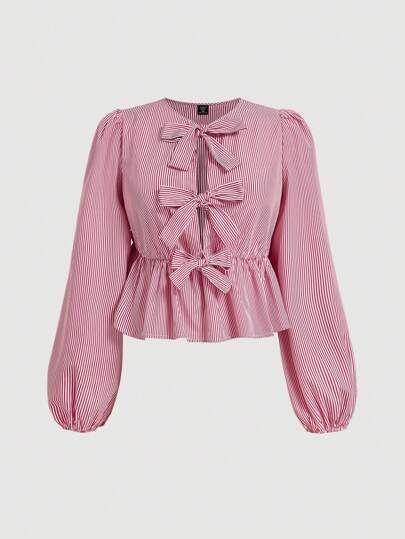 SHEIN MOD Blusa roja a rayas con cuello de Peter Pan y tirantes con moño, en tallas grandes. Camisa navideña - Rojo y blanco - Añade 1