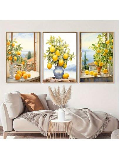 Tríptico de 3 piezas, Paisaje de Amalfi con limones, arte rural de granja, decoración de sala de estilo estético, arte de pared italiano, arte cítrico, decoración del hogar moderna, lienzo, póster de arte de pared - Multicolor - Añade 10